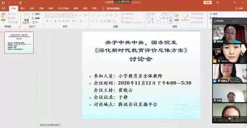 为深入学习贯彻落实中共中央、国务院印发的《深化新时代教育评价改革总体方案》,切实将思想和行动统一到党中央关于深化新时代教育评价改革的决策部署上来,深入推进新时代学校教育评价改革,20201112日下午,教育学院组织全体教师和学生党员深入学习研讨《总体方案》,全面领会文件思想精髓。