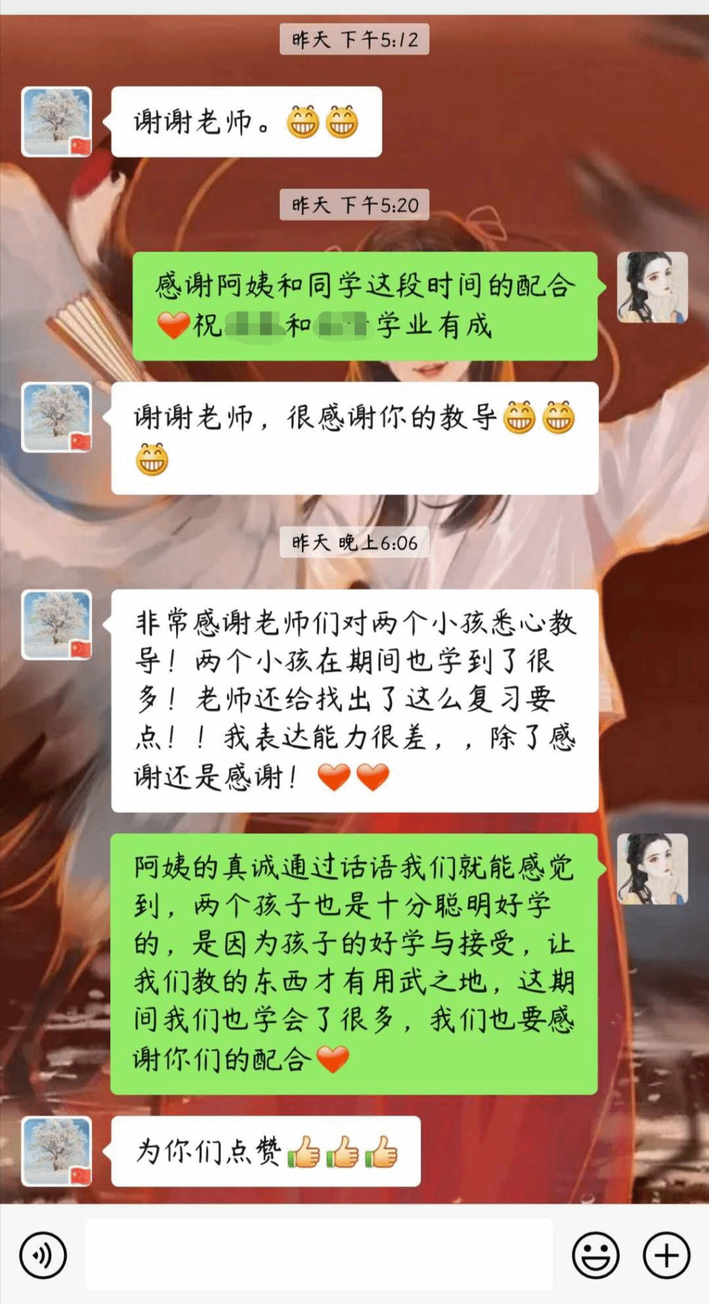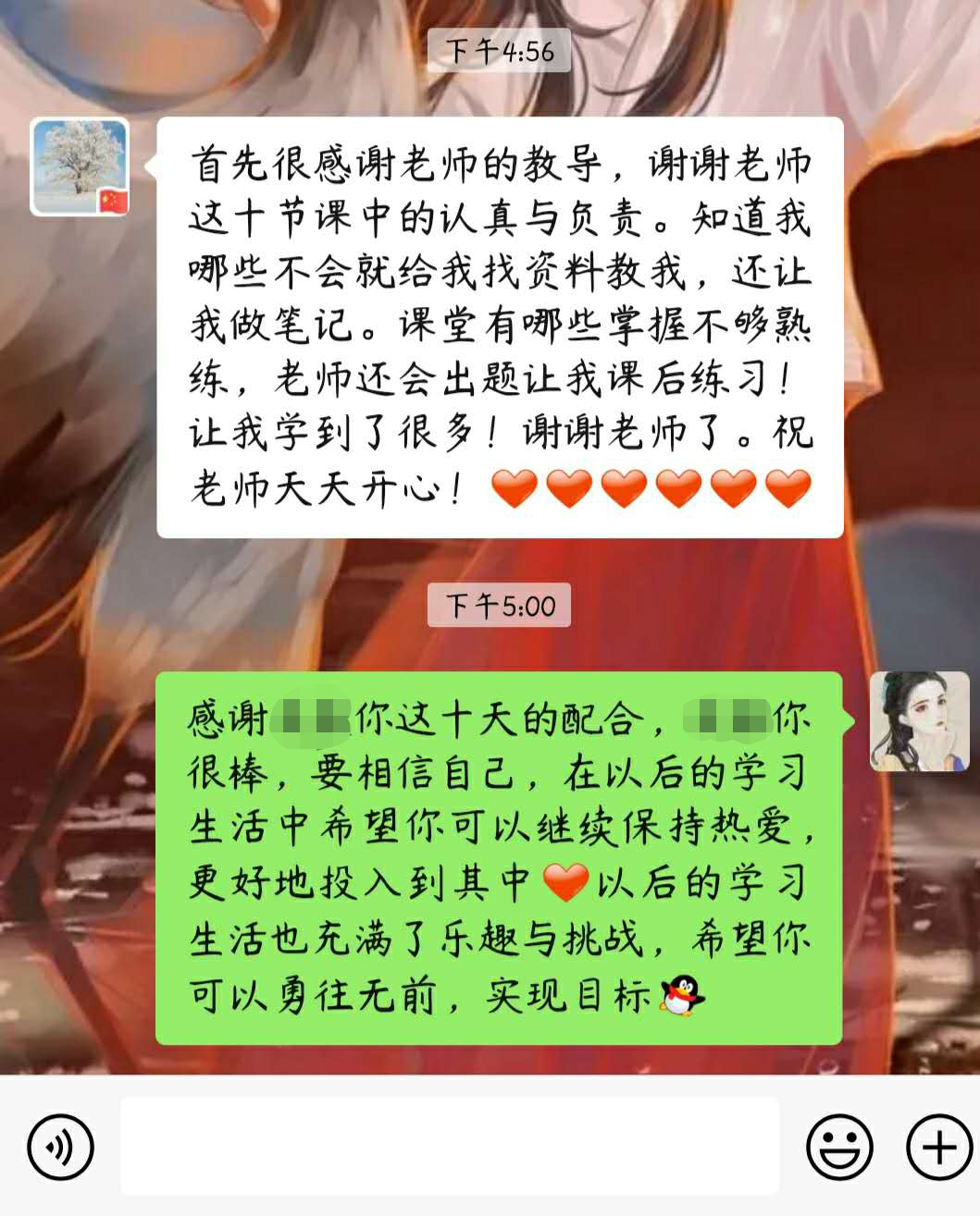 总结:其实这10日的辅导,是在我意料之外的。接到要辅导小廖同学的消息时,我们的活动其实已经接近尾声了。但是我们还是积极与家长和孩子对接,认真备课。王阿姨是一位很和善的家长,也十分尊重我们,在平日里的交流过程中都能体现出来。小廖同学是一位很腼腆的小女孩,第一次上课的时候都不好意思和我说话。但是随着课程的进行,我们也算是慢慢熟络起来,她开始主动和我说话、自己没听明白或者看不清图片也能够大声的告诉我。正所谓教学相长,在小廖同学学得一些知识的同时,我也在这个过程之中将曾经大学课堂上学得的教学知识和技巧转化为了真正属于我自己的东西。很感谢学院能给我们提供这个机会,也很感谢王阿姨和小廖同学的配合和支持。