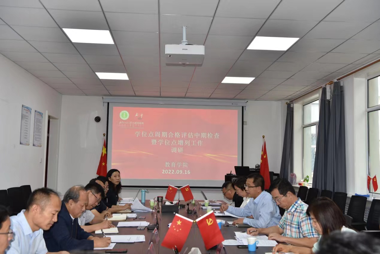 2022916日下午,学校党委委员、副校长宫箭,研究生院院长刘官厅、科技处(社科处)处长贾美林等一行深入教育学院调研指导学位点周期合格评估中期检查暨学位点增列工作。院党委书记周越,党委副书记、院长米俊魁,副院长边琦、赵荣辉以及学院各学位点主任、部分教师参加了本次调研会。