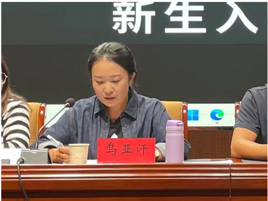 9月22日,教育学院面向2022级本科生、研究生以及专升本同学在图书馆二楼报告厅召开入学教育系列活动—教务与学工管理,教务办主任李嘉峪、团学辅导员于国佳、苏日娜、胡建芳、乌亚汗出席大会,会议由于国佳主持。